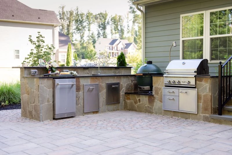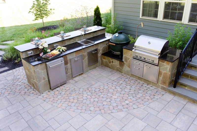 This wonderful client came to Outdoor Dreams looking for an area to entertain family and friends. Their outdoor living space includes a wood-burning fire pit, pergola-covered dining area, masonry stairs, bench-style sitting walls, hot tub, television, and an expansive outdoor kitchen. The patio is composed of BLU 60 slabs from Techo-Bloc and includes a unique inlay of Antika pavers. The masonry structures feature split face veneer using colonial wall stone. The expansive outdoor kitchen features a gas grill, egg smoker, grill lamp, sink, refrigerator, trash drawer, and bar-top seating. The hardscape structures are complemented by the expansive landscape and outdoor lighting. Whether entertaining a group or casual evening watching sports on the television, the homeowners use this space almost every day.